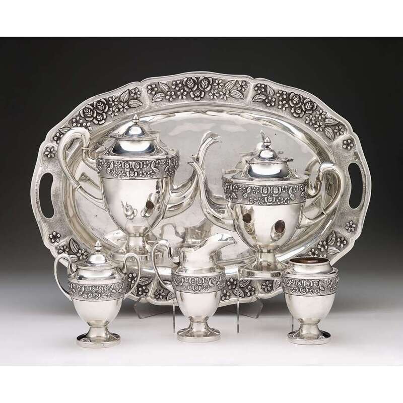 Comprising a coffee and teapot, creamer, covered sugar, waste bowl, and twin-handled oval tray, each with band of repoussé flowers on a stippled ground at shoulder, raised on circular pedestal foot. (6).