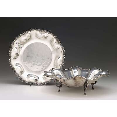 The first a large center bowl with scalloped and lobed rim raised on four scroll-form feet; the second a shallow circular dish with lobed rim, each with applied scroll border. (2).