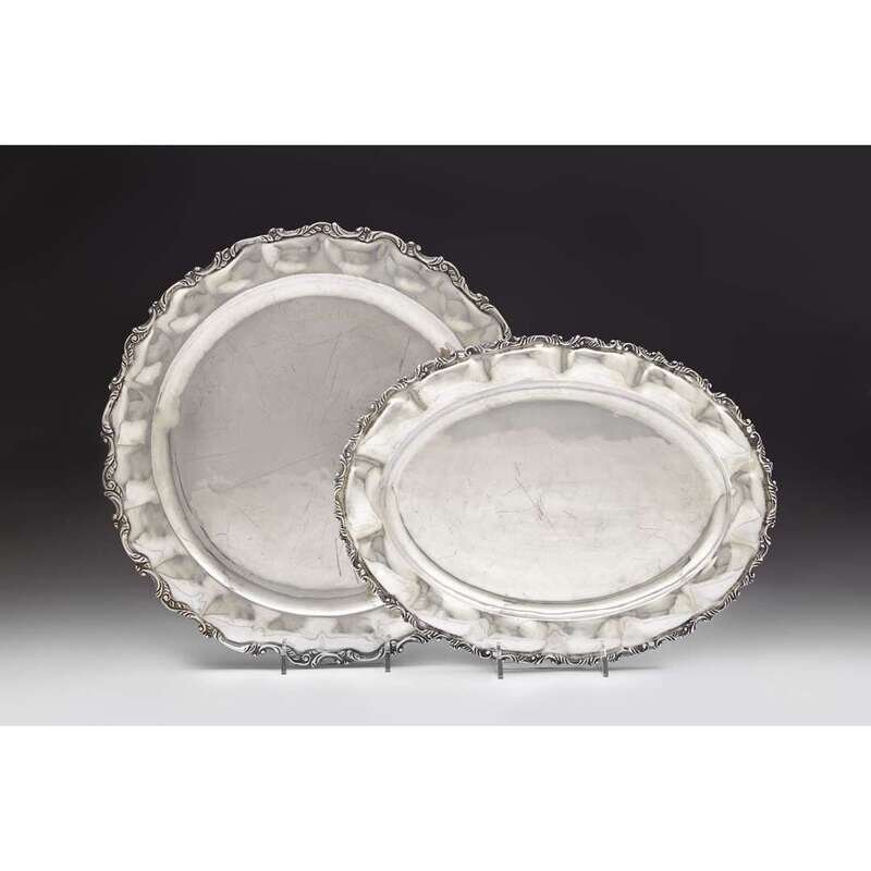 One of circular form, the other oval, each with wide lobed rim and applied scroll border. (2).