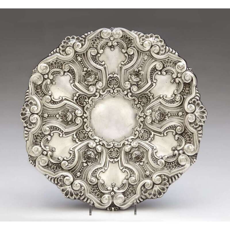 Large shaped circular shallow bowl with scroll, shell, and floral decoration, .833 standard.