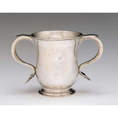 Typical form with flared rim raised on stepped circular foot with twin scroll handles, monogrammed "N".