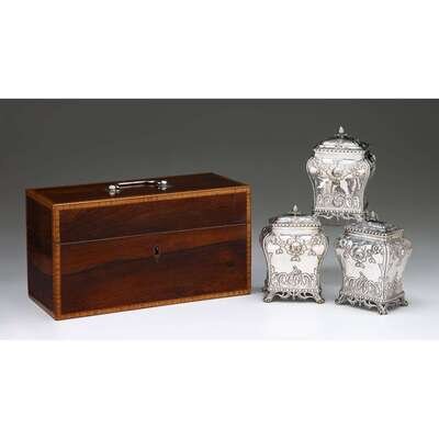 Comprising two tea caddies and a sugar canister, of bombe form on openwork scroll feet, repoussé and chased with swags of flowers and scrolling foliage, with domed cover surmounted by flower bud finial, in fitted silver-mounted mahogany and satinwood box. (3).
