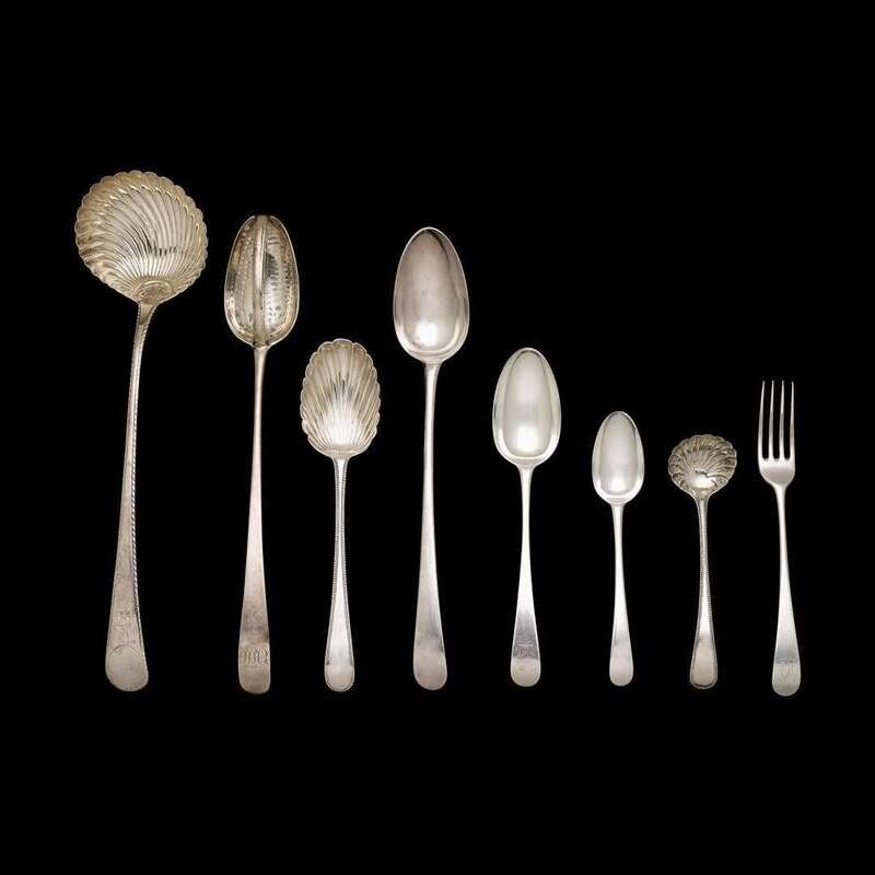Comprising six dinner forks (1780-81); twelve place spoons (1790-91); sixteen table spoons, four with different pattern (1781-82 and 1788-89); two stuffing spoons (1781-84); one strainer spoon (1776-77); one large punch ladle and two serving spoons with shell-form bowls (1778-79); two shell-form ladles (1786-88); some monogrammed or engraved; together with twelve miscellaneous dinner knives. (54).