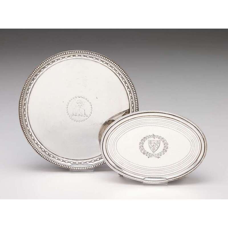 Circular with bellflower inner rim within beaded border with central armorial, raised on three openworked feet; together with an oval teapot stand by Duncan Urquhart & Naphtali Hart, London, 1802-03. (2).