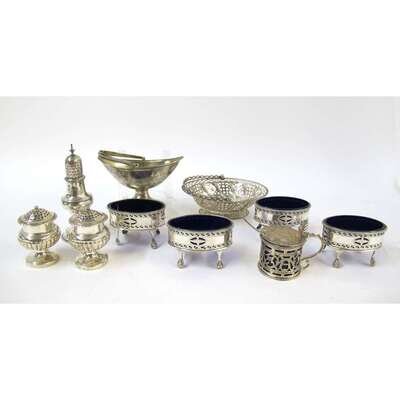 Comprising four open salts with fitted cobalt glass liners, 1785-86; a mustard pot with cobalt glass liner and spoon, 1781-82; a pair of lobed casters, 1788-89; a baluster-form caster, 1790-91; a swing-handle sugar basket, 1787-88; and an openworked sweet meat basket, 1784-85. (10).