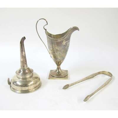 Comprising a creamer with beaded edge on square plinth, a wine funnel, and pair of sugar nips. (3).