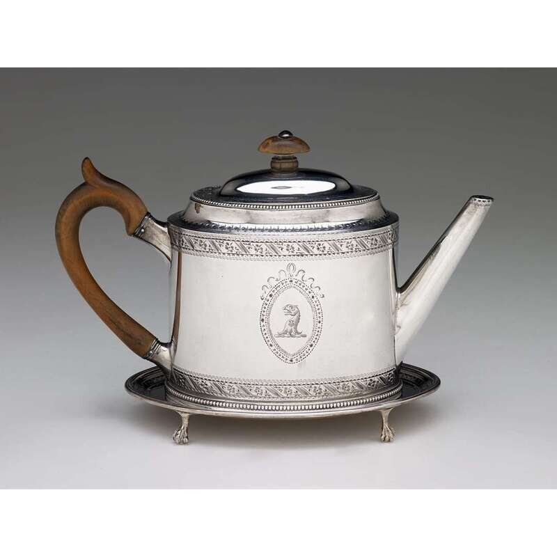 Oval form with beaded edge and engraved stylized foliate band, engraved with family crest within oval cartouche, with wooden handle and finial; together with an associated oval teapot stand by William Plummer, London, 1786-87. (2).