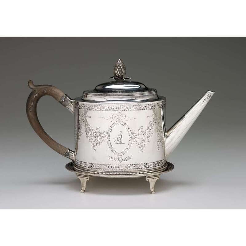 Oval form with beaded edge and engraved with festoons, hinged cover surmounted by pineapple-form finial with wooden scroll handle; together with an associated oval teapot stand by William Bennett, London, 1802-03. (2).