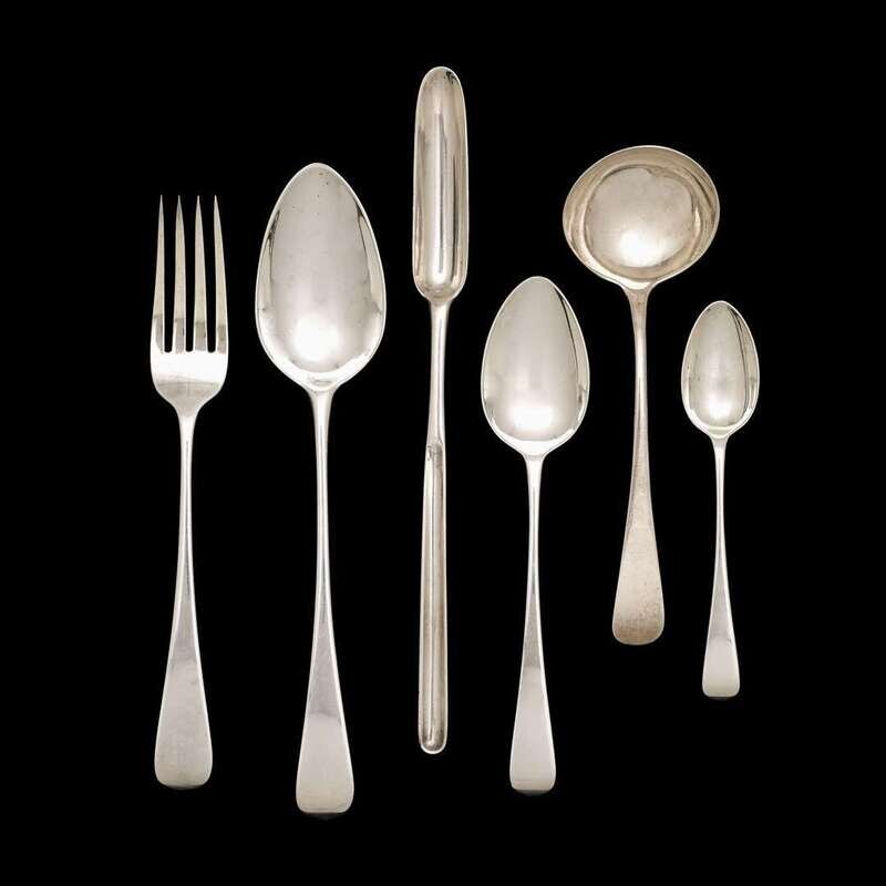 Comprising twelve each dinner forks, luncheon forks, table spoons, place spoons, teaspoons; one marrow scoop, 1801-02; together with a ladle by Charles Hougham, 1792-93; and a silver-plated marrow scoop. (63).
