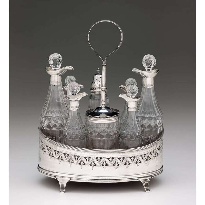 Navette-shaped cruet with band of pierced and chased foliage and bellflowers, fitted with eight cut-glass and silver bottles, monogrammed.
