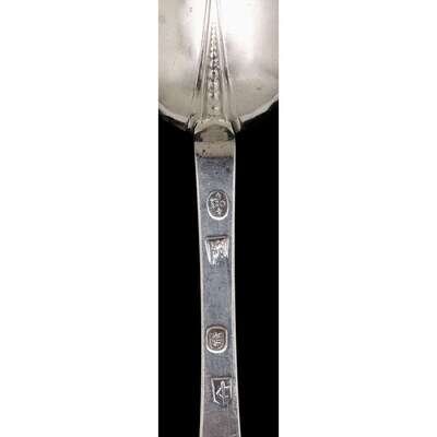 Each with a beaded rattail to reverse, the stem prick-dot engraved with the initials "L/PE." (2).