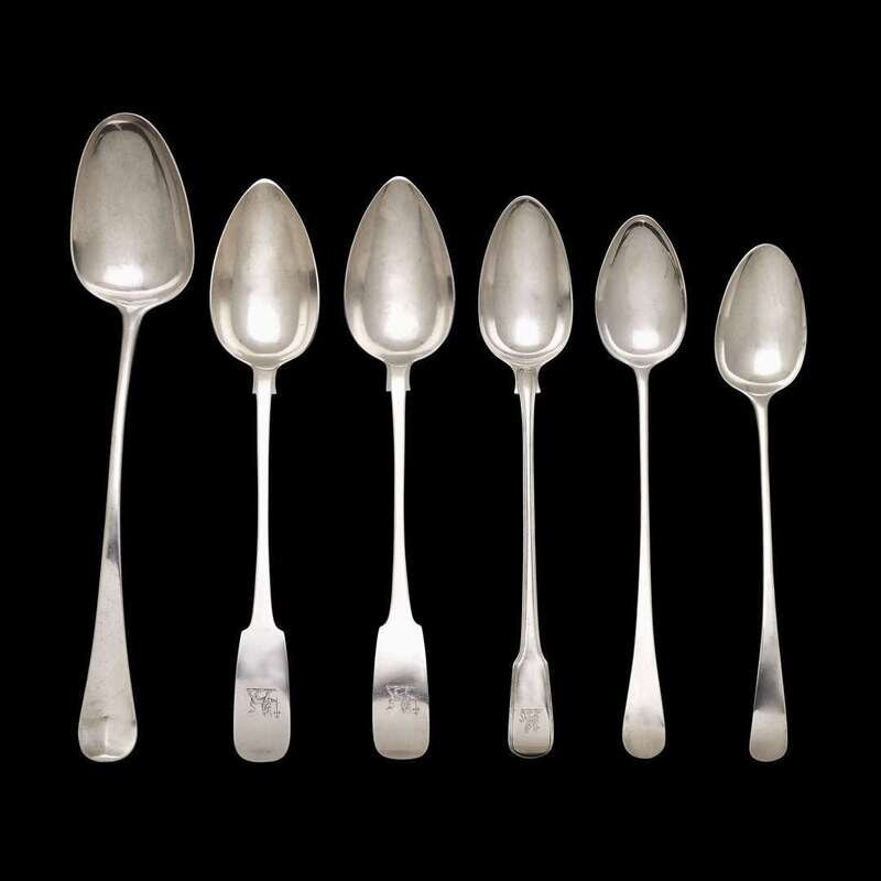 Comprising two spoons by James Scott, Dublin, 1829-30, with initials I.E.D. to reverse and engraved family crest to terminal; one by Thomas Wallis II, London, 1796-97; one by George Smith III & William Fearn, London, 1792-93, with engraved family crest to terminal; one London, 1805-06, and another with marks rubbed, monogrammed M to reverse. (6).