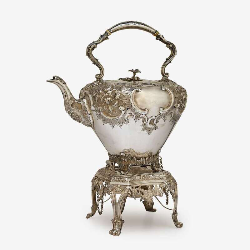 Repoussé and chased with florals, scrolls, and rocaille throughout, raised on openworked stand.