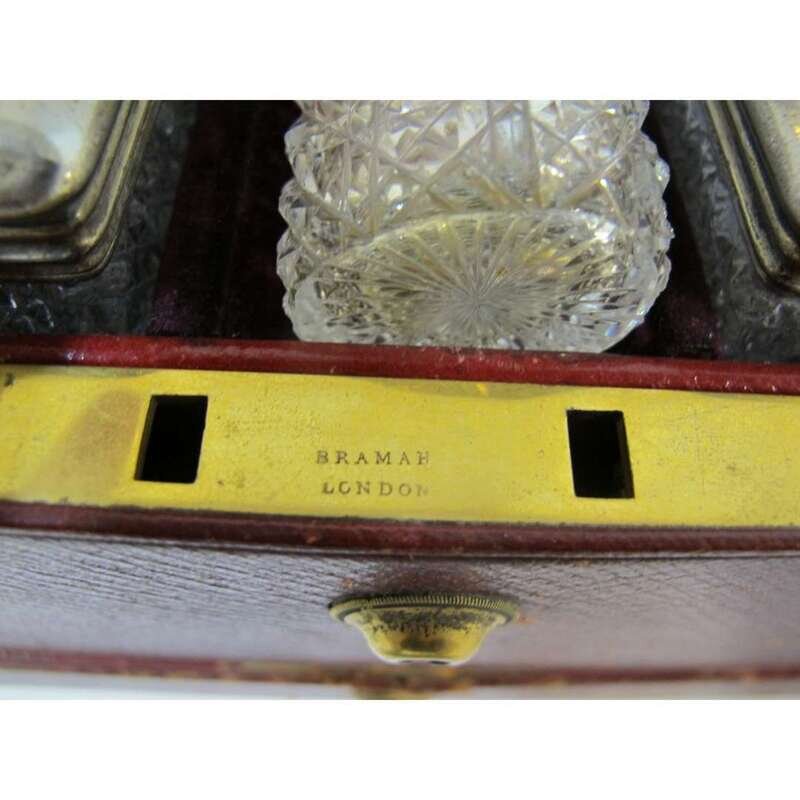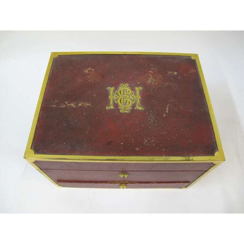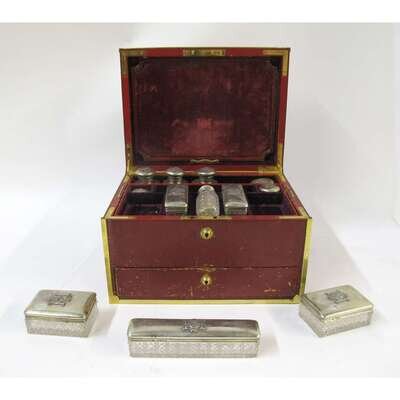 Comprising twelve cut-glass bottles and jars with monogramed silver-gilt covers and a removable brass mirror, all cased within a red shagreen covered and brass banded box with Bramah lock.