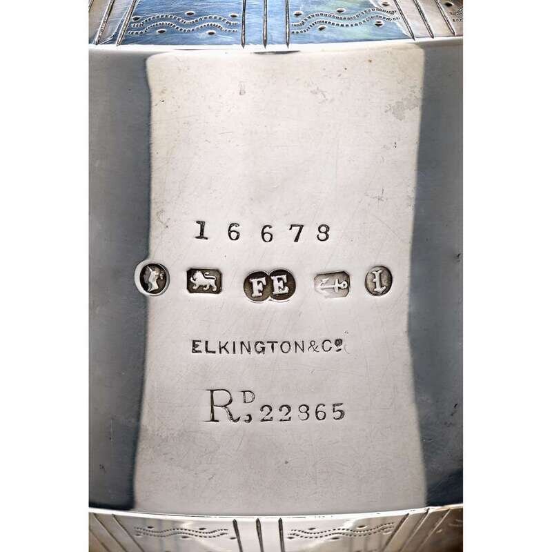 86 The hemispherical bodies engraved with band of geometric and linear design, the spout of milk jug engraved with radiating sun motif, the undersides with hallmarks, pattern number "16678," registration number "Rd. 22365," and engraved "Elkington & Co." (2).