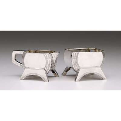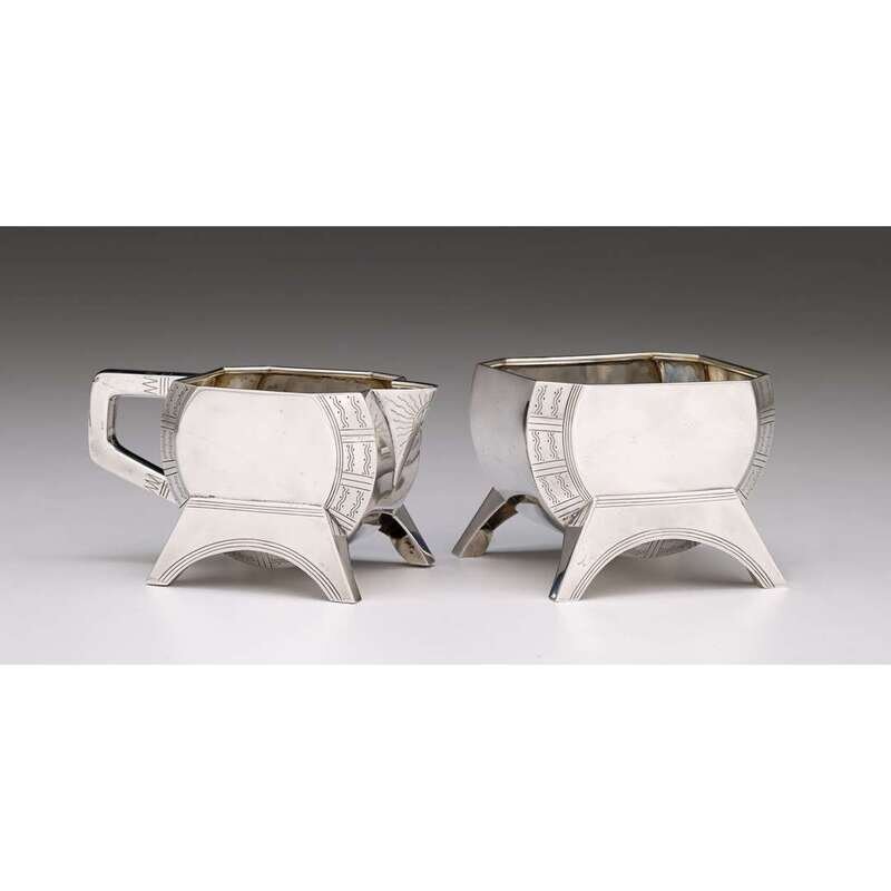 Rare Victorian silver milk jug and sugar designed by Christopher Dresser for Elkington & Co., Birmingham, 1885-