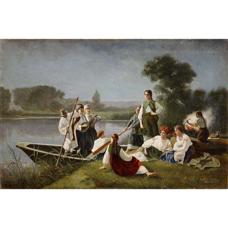 KONSTANTIN ALEKSANDROVICH TRUTOVSKY (UKRAINIAN 1826-1893) UKRAINIAN VILLAGERS ALONG THE SHORE