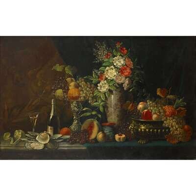 MAX OTTO BEYER (GERMAN 1863-1902) TABLETOP STILL LIFE WITH ASSORTED FRUITS, VASE OF FLOWERS, AND OYSTERS