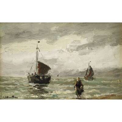 GERHARD ARIJ LUDWIG MORGENSTJERNE MUNTHE (DUTCH 1875-1927) BOATS AND FISHERWOMAN ALONG THE COAST