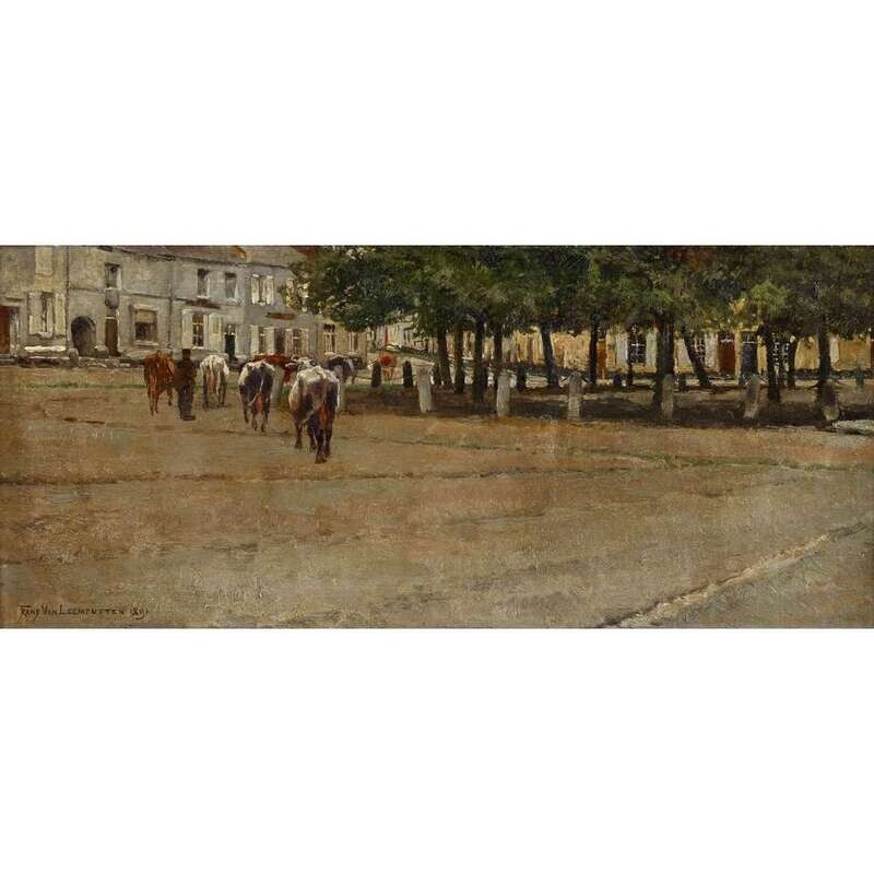 FRANS VAN LEEMPUTTEN (BELGIAN 1850-1914) COWS IN A TOWN SQUARE