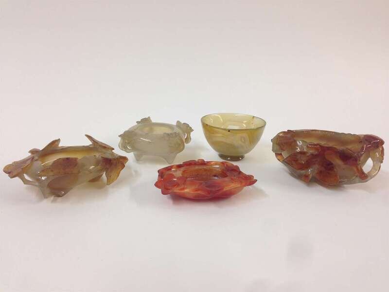 comprising a small tripod censer, three lotus-form brush washers, and an unadorned cup.