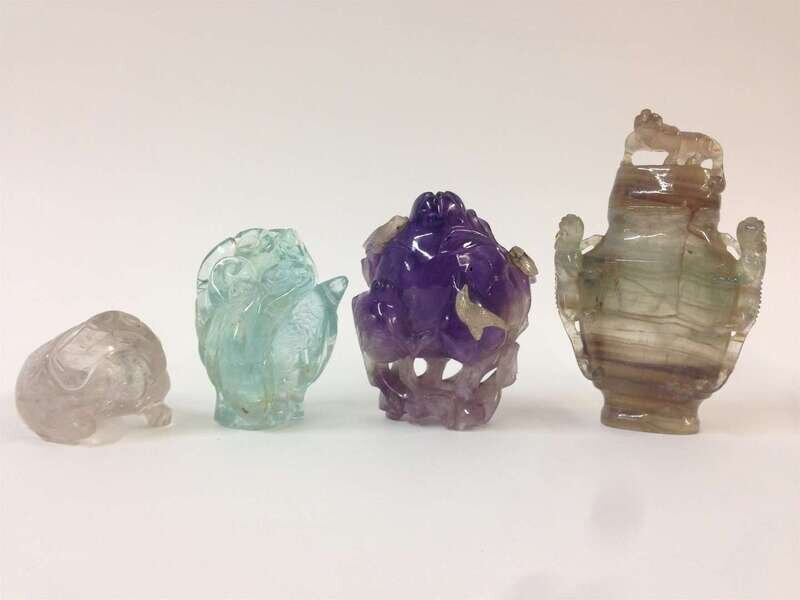 comprising a banded agate covered vase, an amethyst pomegranate carving, an aquamarine 'three plenties' carving, and a rock crystal three-legged toad brush washer.