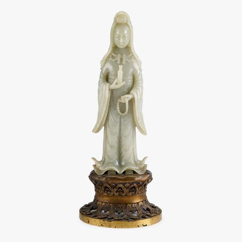 A Chinese celadon jade figure of Guanyin holding a necklace and a sacred vase 19th/20th century