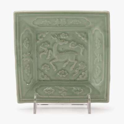 A Chinese celadon glazed stoneware square plate with deer design yuan dynasty