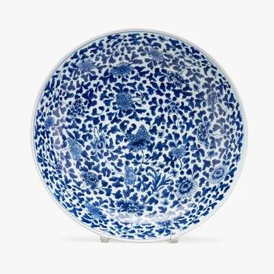 A Chinese blue and white porcelain floral charger artemisia leaf mark, kangxi period