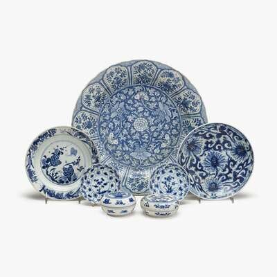 A group of seven Chinese blue and white shipwreck export porcelain wares kangxi period