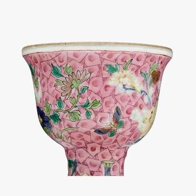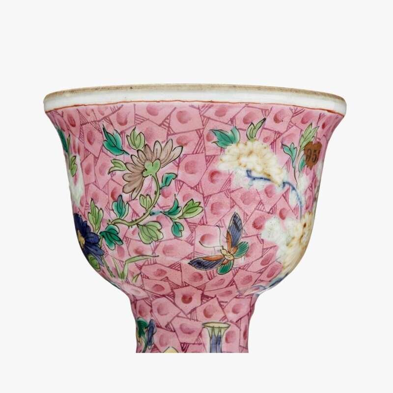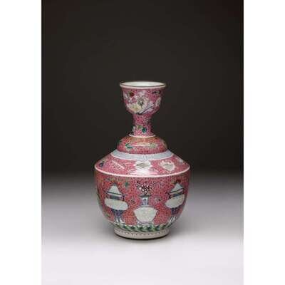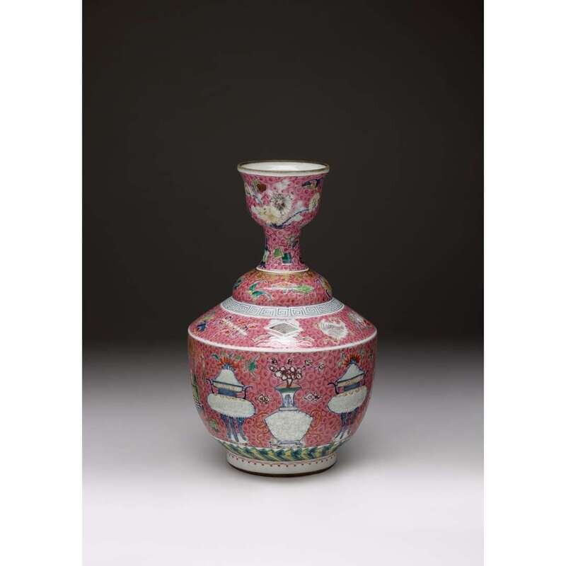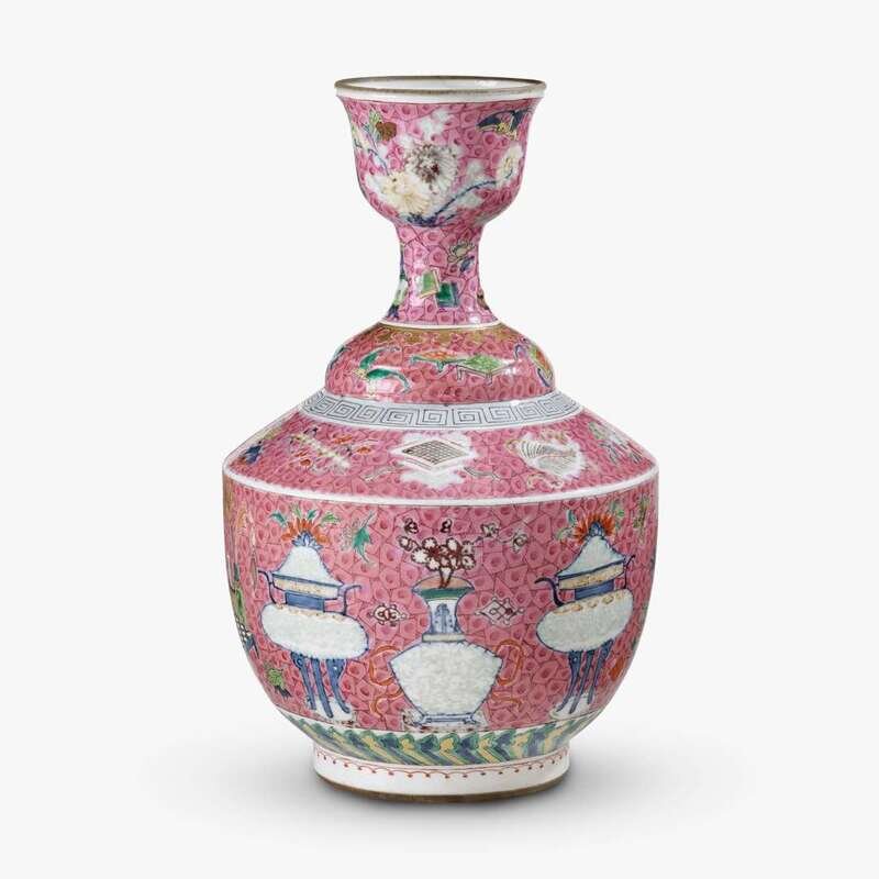 An unusual Chinese pink ground underglaze and famille rose enameled vase with cup-form rim 18th century