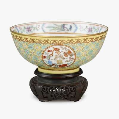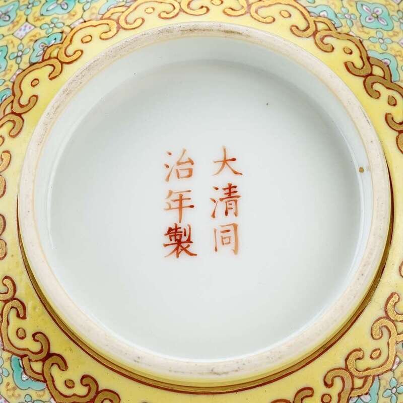 A Chinese yellow ground famille rose enameled porcelain 'baijixiang' bowl iron-red six character tongzhi mark and of the period