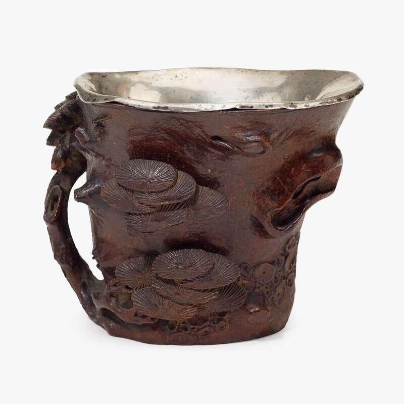 A Chinese carved 'pine tree' bamboo cup with silver insert liner 17th/18th century