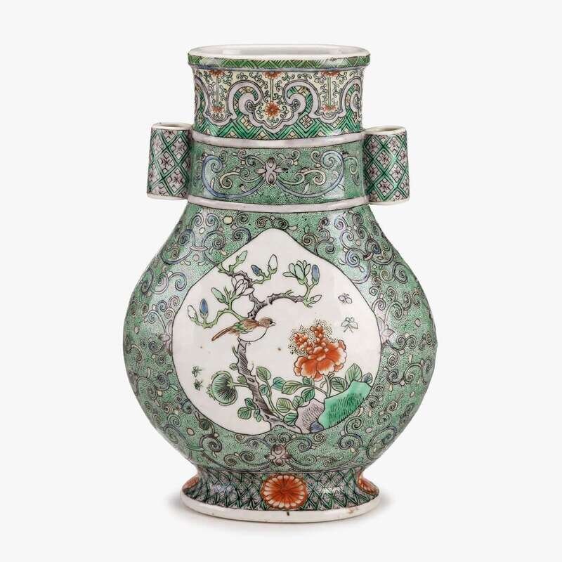 A Chinese famille verte enameled porcelain arrow-handled 'Hu' vase 19th century