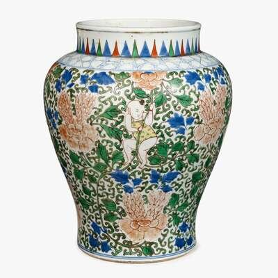 A Chinese wucai enameled porcelain 'boy and lotus' jar qing dynasty