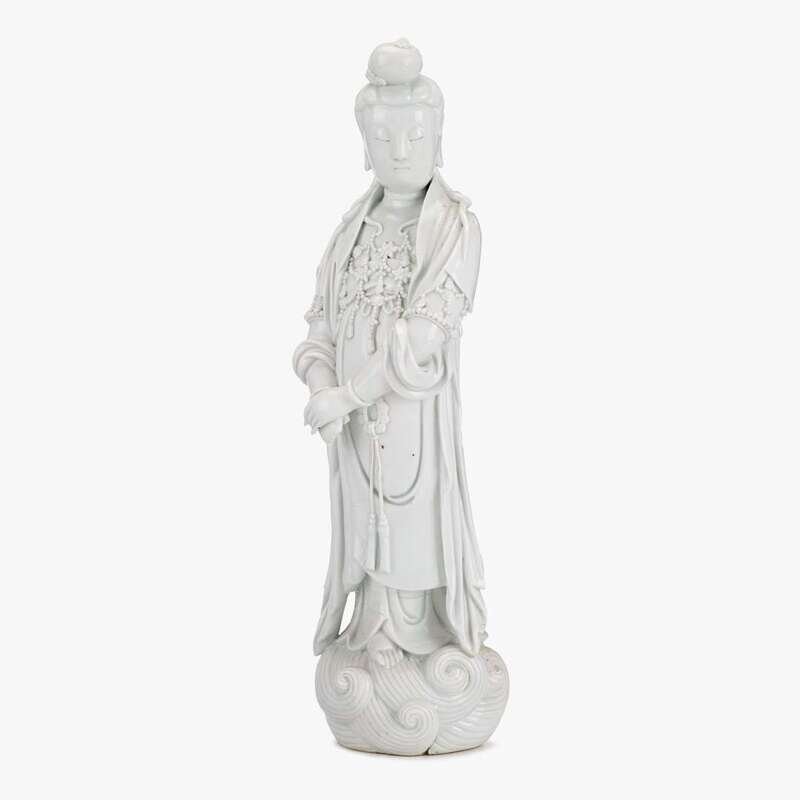 A Chinese blanc de chine porcelain figure of Guanyin on waves double gourd impressed mark and boji yuren seal, attributed to su xuejin