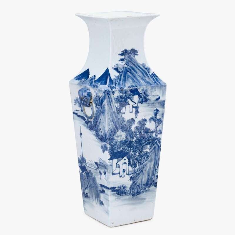 A Chinese blue and white porcelain square vase with lion mask handles 19th century