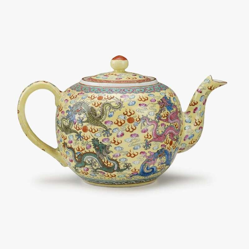 A Chinese yellow ground famille rose enameled porcelain 'dragon' teapot iron-red guangxu six character mark, republic period