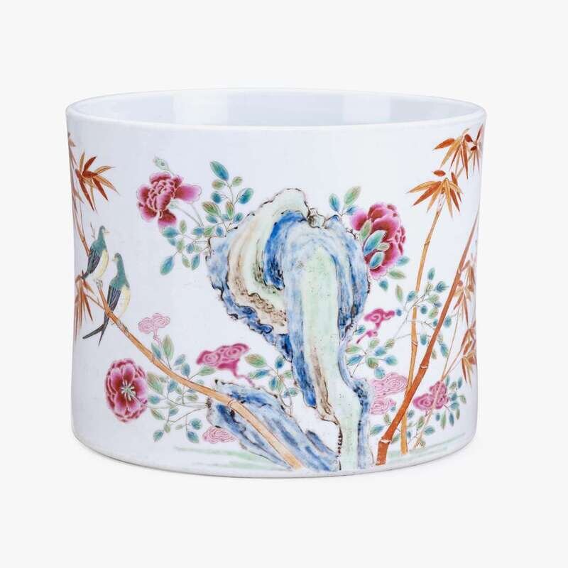 A Chinese cylindrical famille rose enameled porcelain brush pot decorated with floral designs republic period