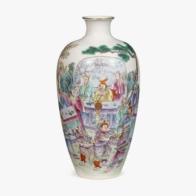 A Chinese famille rose porcelain vase with gilt lip decorated with figural scenes qianlong mark to base, 20th century
