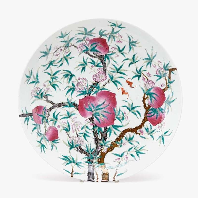 A large Chinese enameled porcelain charger decorated with ripe peaches on branches qianlong six character mark, early 20th century