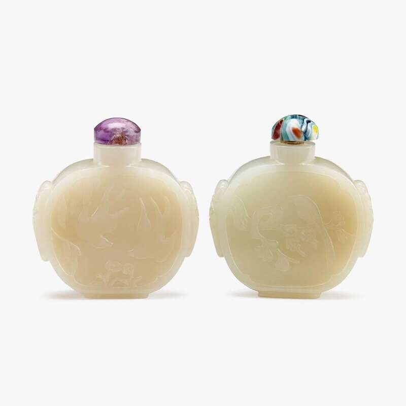 Two Chinese white jade round snuff bottles, carved with birds to body 19th/20th century