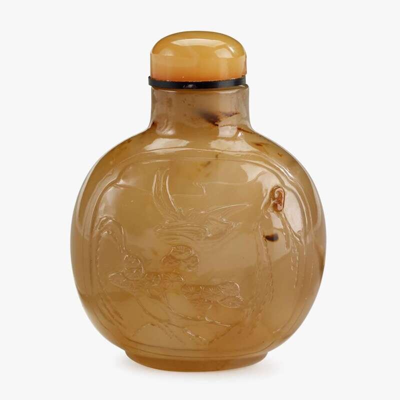 A Chinese cameo agate snuff bottle, carved with crane to surface and phoenix verso qing dynasty