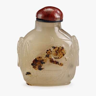 A Chinese cameo agate snuff bottle, carved with tiger and boats qing dynasty