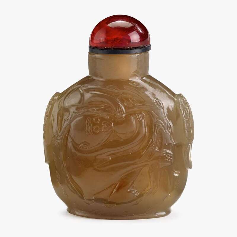 A Chinese cameo agate snuff bottle, carved with monkey qing dynasty