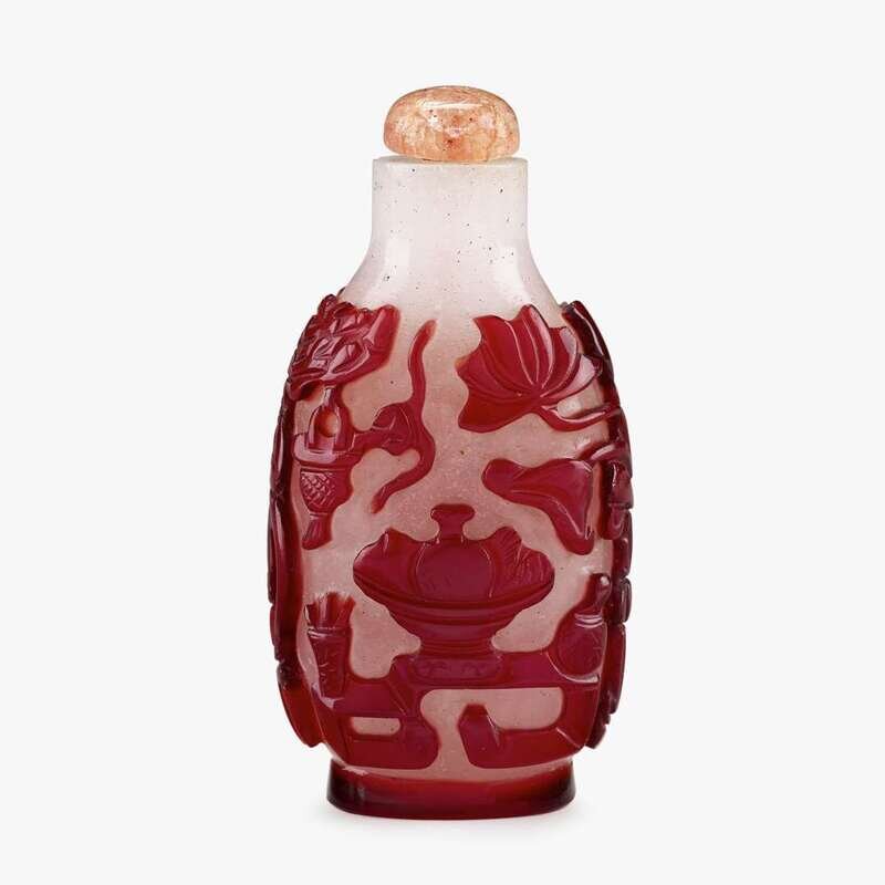 A Chinese red-overlay on snowflake glass snuff bottle, with antiquities qing dynasty