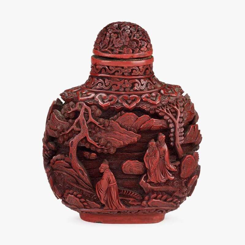 A large Chinese cinnabar lacquer round snuff bottle, carved with scholars in landscapes 19th century