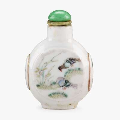 A Chinese famille rose enameled porcelain snuff bottle, with pigeons and lingzhi daoguang four character mark and of the period