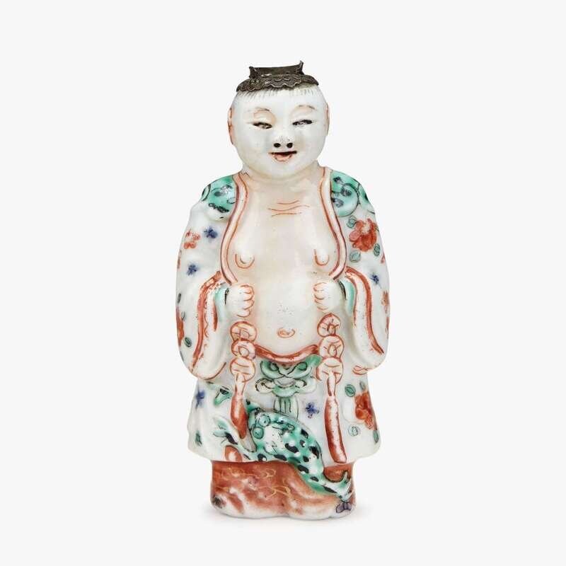 A Chinese famille rose enameled porcelain 'Liu Hai' figural snuff bottle 19th century