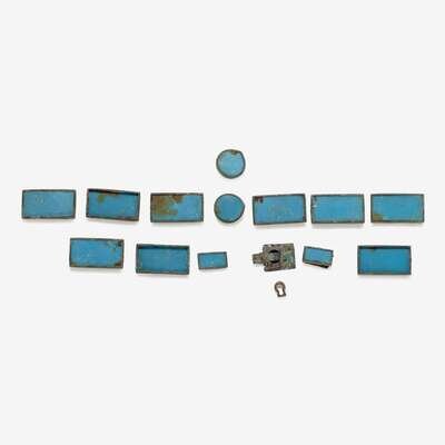 A collection of fourteen Chinese blue glass on wood-back belt plaques ming dynasty
